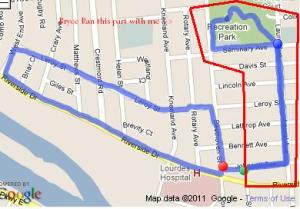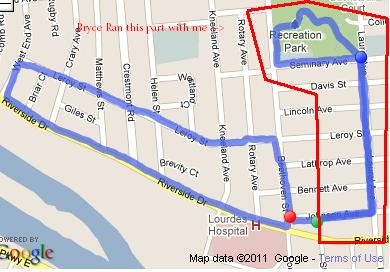Bryce Ran from the green dot, up through Rec. Park and back - The Blue Dot is where we stopped and stretched.
