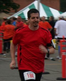 The first mile marker I ran by at 7 minutes. This made me more than a we bit nervous as I was used to running 9-10 minute miles on my runs, but I kept going. (As a side note, I was averaging 8 minute miles in my races last year.) It was great weather to be out running – slight sprinkle occasionally, cool and no wind. Just before the two-mile marker one of my co-workers showed up and stayed with me. We hit the 2 mile marker at 14:27, and passed another co-worker just after it. The rest of the run was nice on into the mad house that was the finish area (two corrals, women on the left, men on the right – but no one was aware of it until we got there). My two co-workers got by me (I have never had a kick at the finish). According to my phone, I finished at 22:59, which I was QUITE pleased with. Official results had me at 22:51, which ties my P.R. of last year at the St. James 5k. Since My year started with surgery and I have had 3 different injuries keep me from running this year, I am ECSTATIC!!!