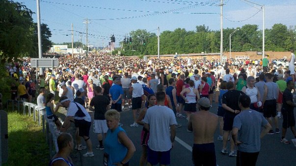 What a fantastic day for a race! It was a gorgeous 58 degrees as the cannon went off! (I think it was still 58 degrees, 11 minutes later when I actually reached the start line as well!) Can I say that 11,000 runners make for a very large crowd (and VERY large lines at the port-a-potties?)