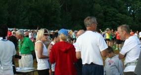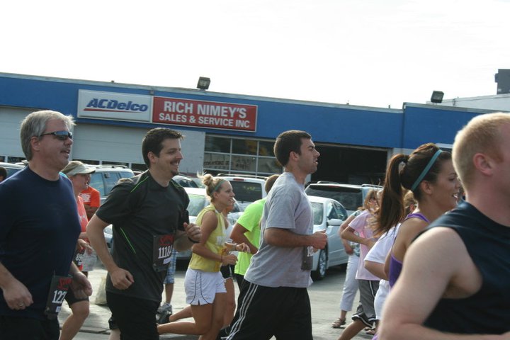 As far as the run itself, the elevation chart on the boilermaker site made it look like the first four miles were up hill, yet Doug told me it wasn’t. Now that I have run the course, I can see there is a slight incline, but I now agree with Doug – it’s not uphill until around the 4 mile marker. Consequently the first 3 miles were pretty easy. I started out at a nice easy pace with Doug, making (Very) entertaining comments about all sorts of things. He seemed to really appreciate the entertaining banter, encouraging me with such phrases as “Do you ever shut up?” and “you know, I can kick your ***.” Having done my job of boosting his morale, I decided to pick up the pace a bit. (This is a good point to mention – the nice thing about starting in the very back of the pack, is you get to pass people the whole way – and you don’t have to be very fast to do so!) Those first three miles, with the very slight incline, were fine – as I approached the fourth, 2 gentleman started talking with me about the KT Tape I had on my calves, and then about my VFFs. This made that hill VERY easy to go up, and by the time I actually realized we had hit it – it was over half way there! It was challenging to dodge the other participants, as people seemed to hit it and just stop and walk. Consequently, we couldn’t keep the pace we might have otherwise.