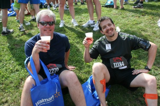 After the race, I leaned on my wife and tried not to fall over (Anne, have I mentioned how much you rock?) Doug arrived and we headed over to the post race party to pick up our goody bags and see what was going on. And what was there? FREE BEER! I have never had a beer directly after a race, let alone FREE BEER right after a race. I think it is best summed up by this picture: