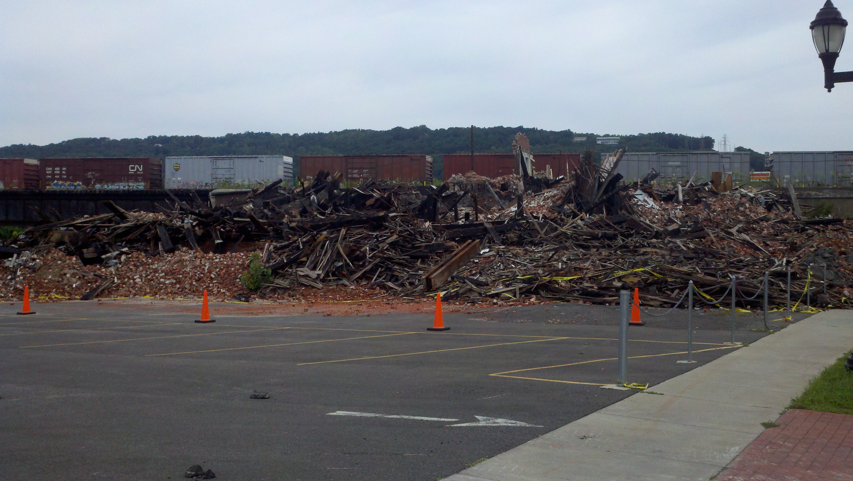 But about the run – it was a beautiful day for it – and I felt good out there.  The temperatures have cooled a little which means my trusty water bottle lasts much longer!  I headed out through glorious down town Binghamton, and at the 2.2 mile marker – I went by a demolished building.  Luckily for you my readers, I KNEW you were going to ask – “Can I see the demolished building?”  And I took a picture for you!