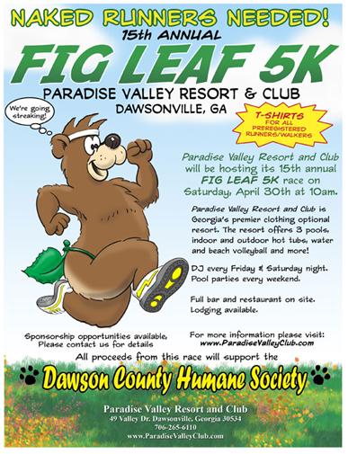 On April 30th of this year the 15th annual Fig Leaf 5k at the Paradise Valley Resort in Dawsonville, Ga occurred. Now what makes the Fig Leaf 5k worth mentioning? Well – the dress code is to wear what you want! Or don’t want! No clothing is required! Barefoot runners eat your heart out – in this race you can go shoeless, pantsless, shirtless – totally NEKKID!