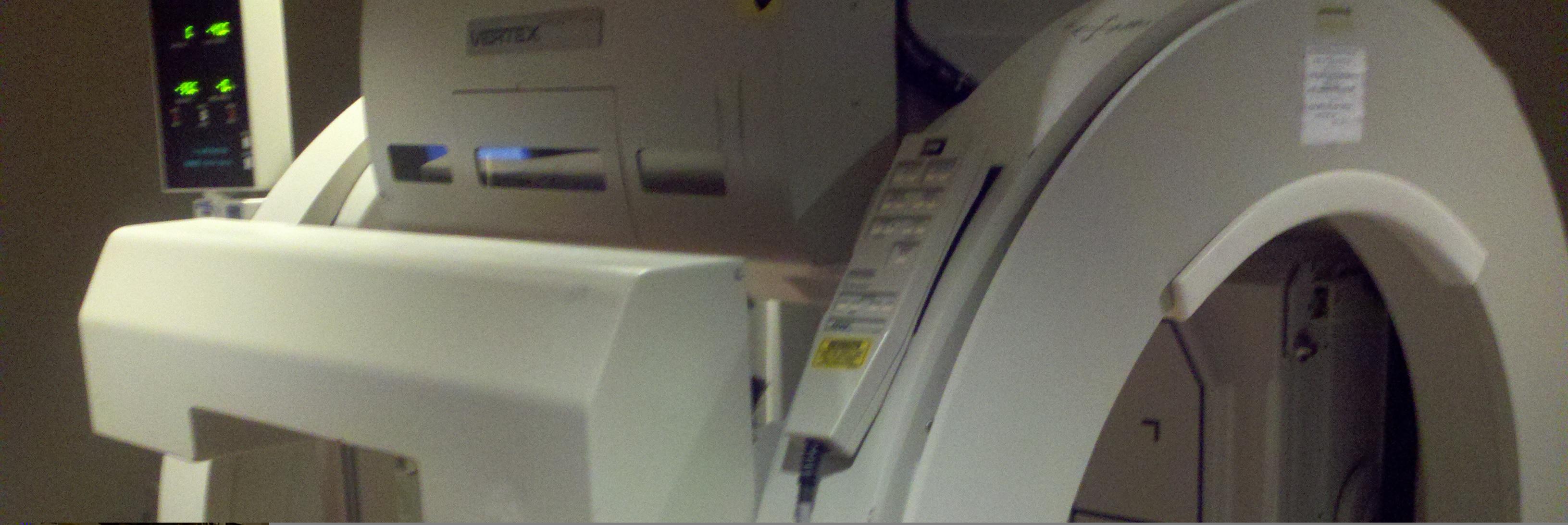 Back to work, then back to the hospital at 11:30. After the required thirty minutes spent sitting in the waiting room (doesn’t it always seem mandatory to you?) in we went for the actual bone scan. Now this time, they actually did a full body scan. It started over my head with it almost touching the tip of my nose. For the next 25 minutes it worked its way down my body slower than a Caterpillar could crawl. I could see the monitor (its blank in the picture, I know – bad timing – but they took my phone away for the full scan) as my skeleton slowly appeared on it.