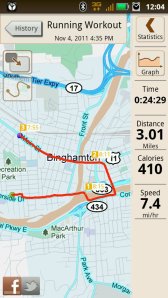 As I am still “Building back up” (yes I say this a lot.. I am reminding myself as well as you – my dear friends!), I decided 3 miles was a good distance for last night’s run. I picked a route that I knew was a wee bit higher, so I would have a fair cool down jog to get home. The route was indeed nice and I quite enjoyed the run! I headed over a couple of bridges, and the leaves on the trees I went by were absolutely gorgeous. My legs felt awesome with no lasting issues (some brief tightness in various muscles, but nothing out of the ordinary), and I felt GREAT! The ONLY negative point – was the cold air in my lungs. It was….cold and it made my breathing very interesting to say the least. I didn’t let it get me down but enjoyed the run. When my cardiotrainer said “3 miles” – I stopped (see how well I am doing on making sure I don’t over do things?.) Then, I took a gander at my times, and keep in mind – I felt GREAT the whole time – not like I was really pushing but like things were “just right:”