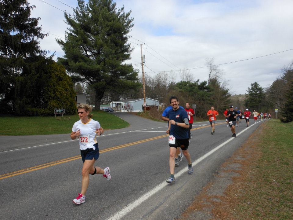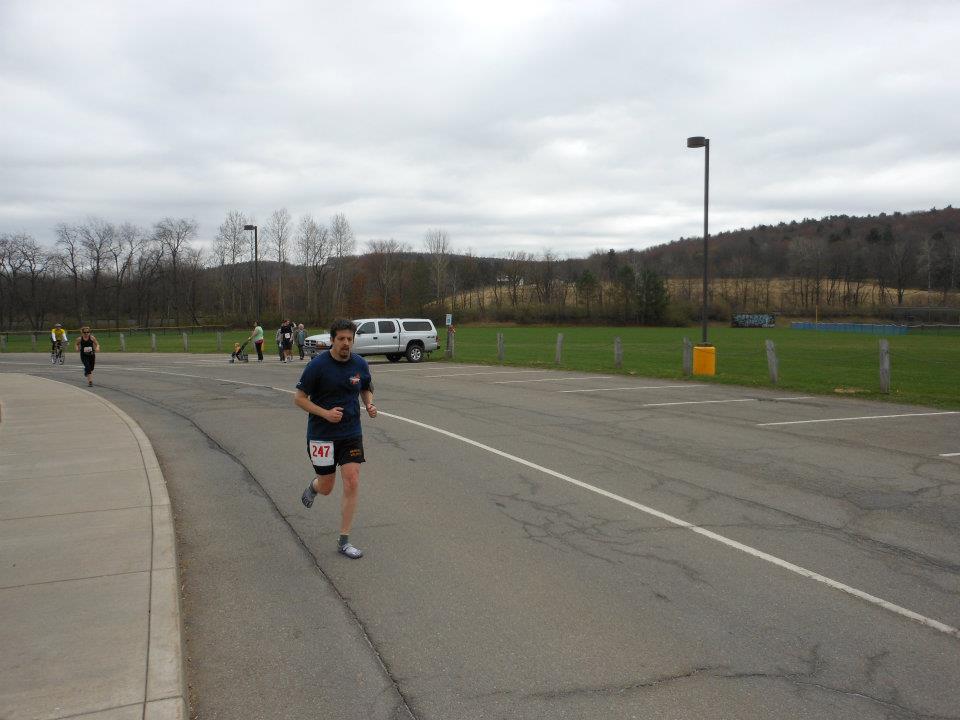 All joking aside – I figured I was probably going to be ok with not doing the early start.  There were around 225 people at the starting line when they yelled “Go” (followed by the beeping of countless GPS watches/phones starting.)  Off we went – around the highschool and into the development in Chenango Forks!  Like every other race in the world, the starting point was crowded – but it had spread out quite well before the first mile marker.  I let Chris go – as he was hoping to come in at 1:15 or faster, while my goal was to beat my 1:30 time from