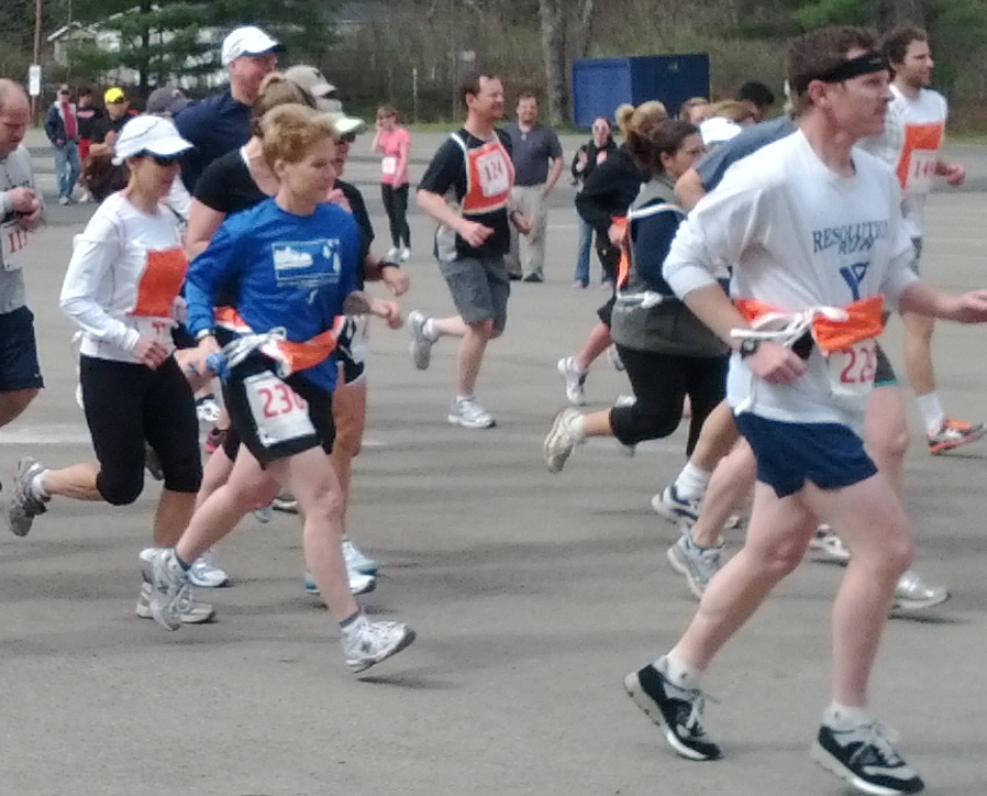 I ended up running with a guy named “John” who was trying for 8 minute miles.  I felt foolish starting at a pace I figured I couldn’t carry for longer than 3 miles – but what the heck!  Sure my legs were tired from walking the maplefest the day before – but nothing ventured, nothing gained!  At mile marker two, when Rebecca snapped the photo, I was still in a great mood.  You can see John’s blue shirt just behind my right shoulder.