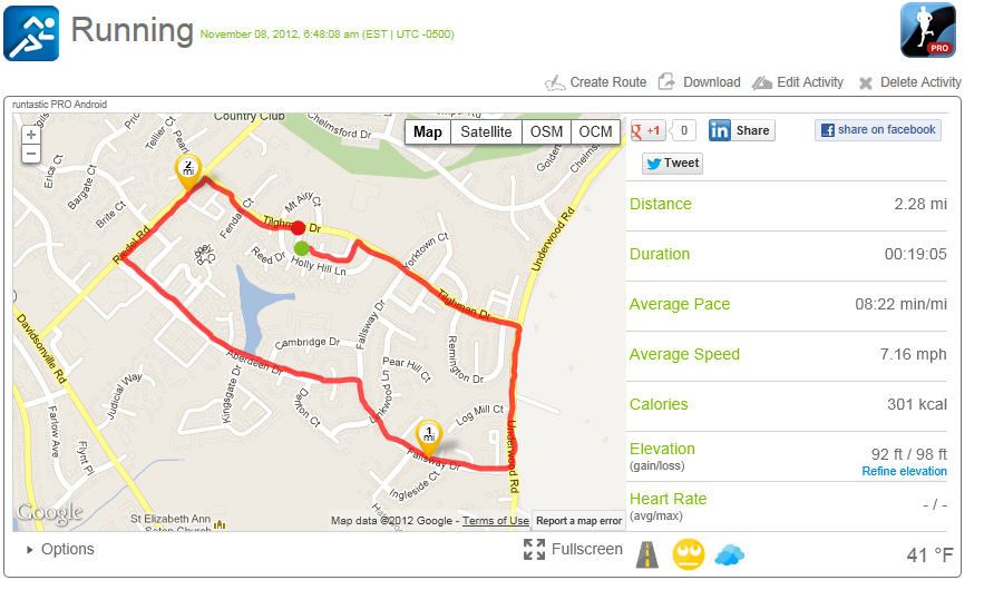 I’m a MyFitnessPal user as well. But I’ve been using RunKeeper instead of runtastic. It gives me all the cool stuff, with a record of all activities, a map of the run, and a graphic of pace and elevation that is interactively keyed to the map. I can “mouse my way” through the run, following the elevation line, for example, and it will show me on the route map where that is. It’s kinda cool to see that. It also will show me my pace at that particular moment in the run. Also kinda cool.