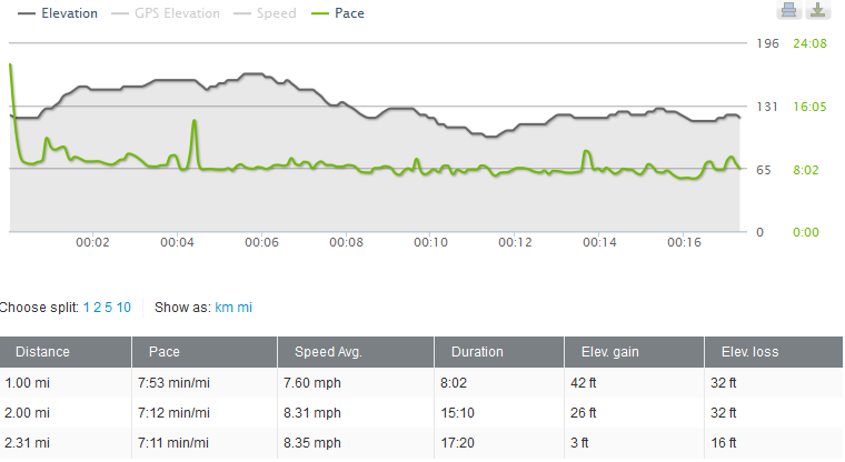 1 Mile. 8 minutes, 02 seconds. Pace 7 minutes 53 seconds. (ok, I have no idea how these two times are different, but they were).