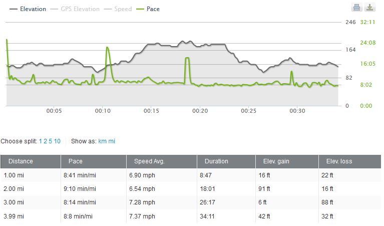 And I was hoping it would help like it did the last time. After the first mile I loosened up a bit, and picked the speed up to around 8:40. This is a hair faster than I hope to run my marathon in.