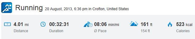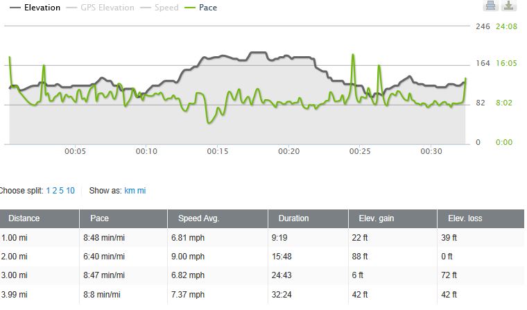 I finished out the next two miles, though I slowed by two minutes (I suspect shock) in my third mile, but mile 4 was a very respectable 8:08.
