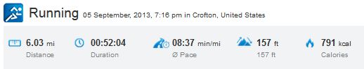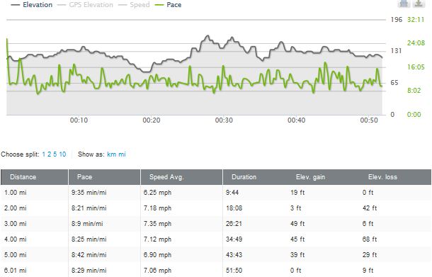If I throw out that first minute, then I did 5 miles in 42:06, or an 8:25 pace. I’m pleased with that. I won’t lie,I would really like to see my times go down into the 7 minute mark for mid-range runs, but there is plenty of time to get there after October 27th.