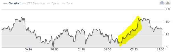 822elevationI was kind enough to high light the 2 mile hill in my elevation chart.  At mile marker 13.06 (the bottom of the yellow), runtastic lists my elevation as 22 feet.   Mile Marker 15.47 (top of the elevation chart) it is 187 feet.  That was a fairly steady climb of 165 feet over 2.5 miles, with the final climb being  121 feet at 15.26 to 187 feet at mile marker 15.47.  That is 67 feet in less than a quarter of a mile!  I was actually doing quite well until that point, but that final steep climb.. Well I got through it by promising myself I could walk a little when I hit the 16 mile mark.