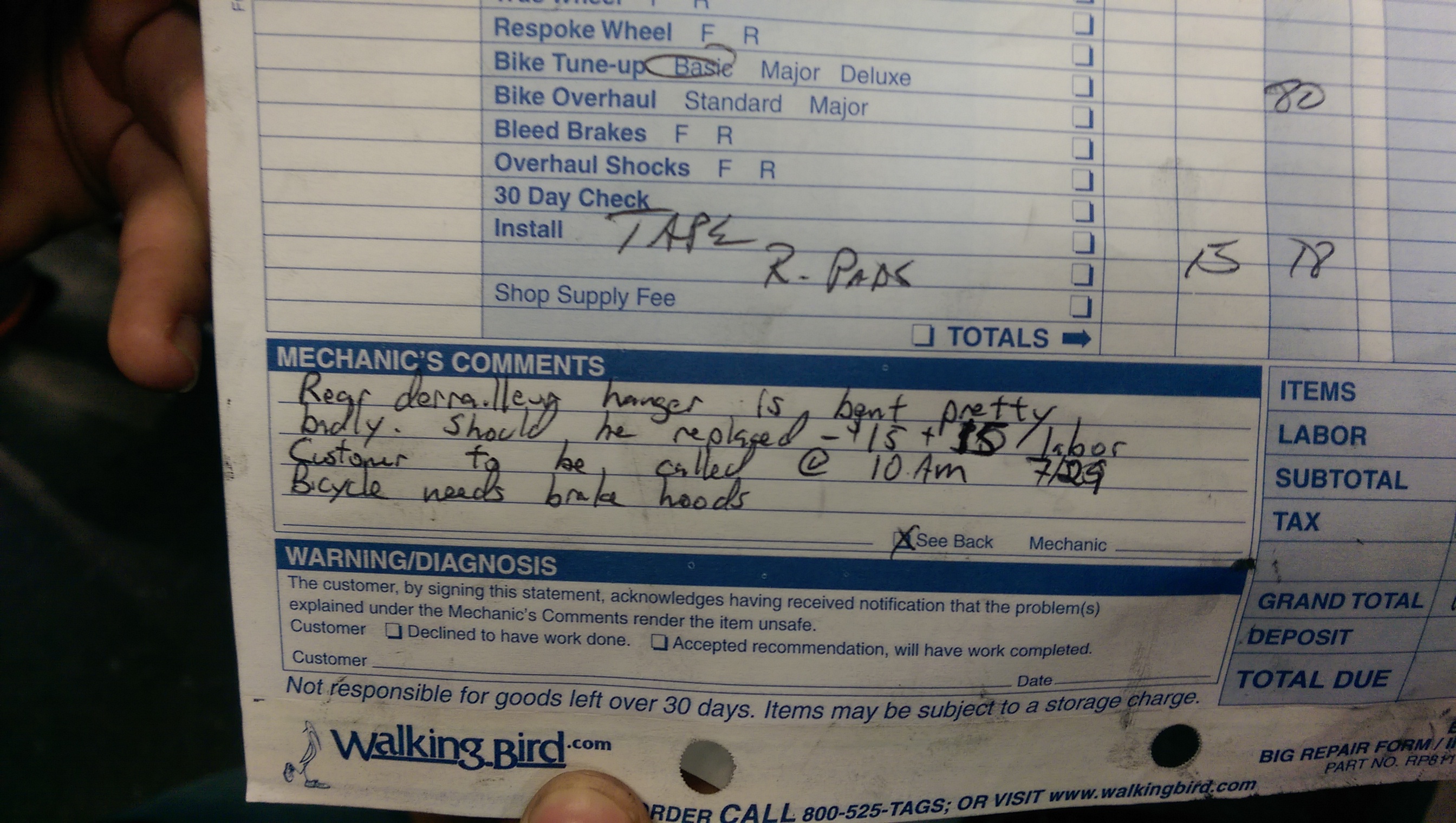 This was on top of the $114 previously quoted for the tune up, brake pads and handlebar wrap.