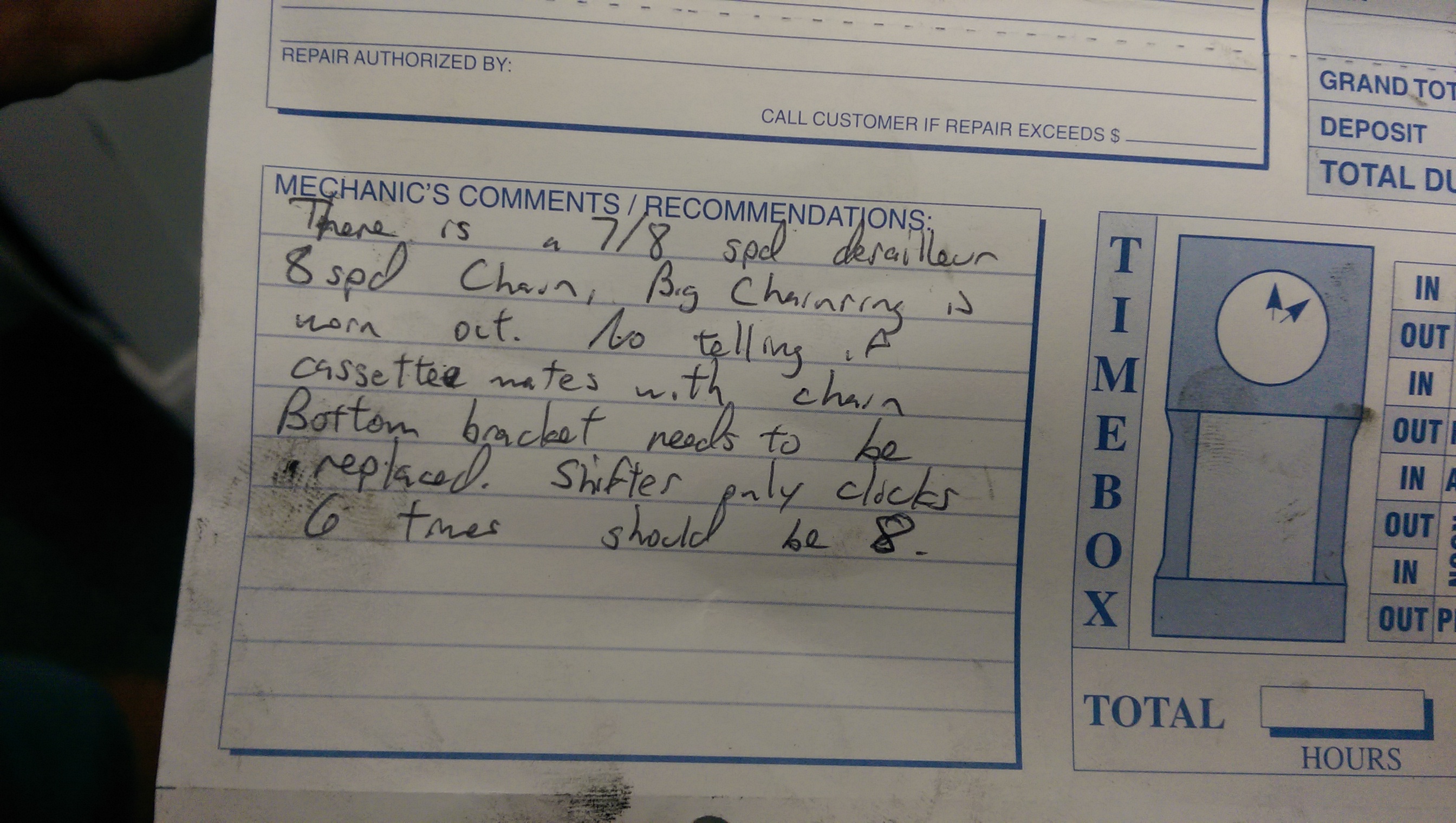 Bottom Bracket Bent (What the heck is a bottom bracket?) another $15 in parts, and $15 in labor.  Sure, why not.