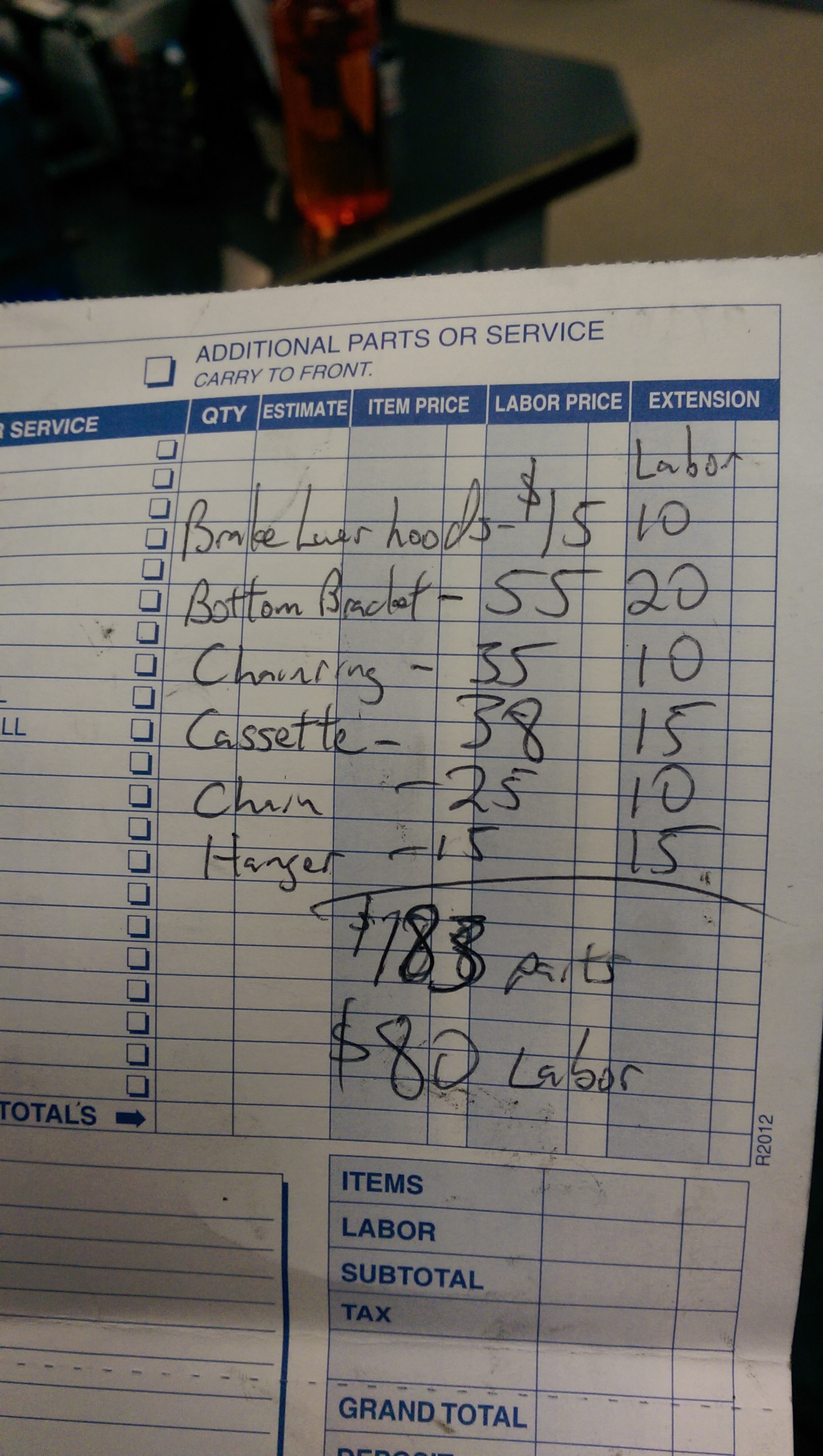 I almost forgot the quote. This was on top of the $114 previously quoted for the tune up, brake pads and handlebar wrap. I have no idea if this is a good price or not.