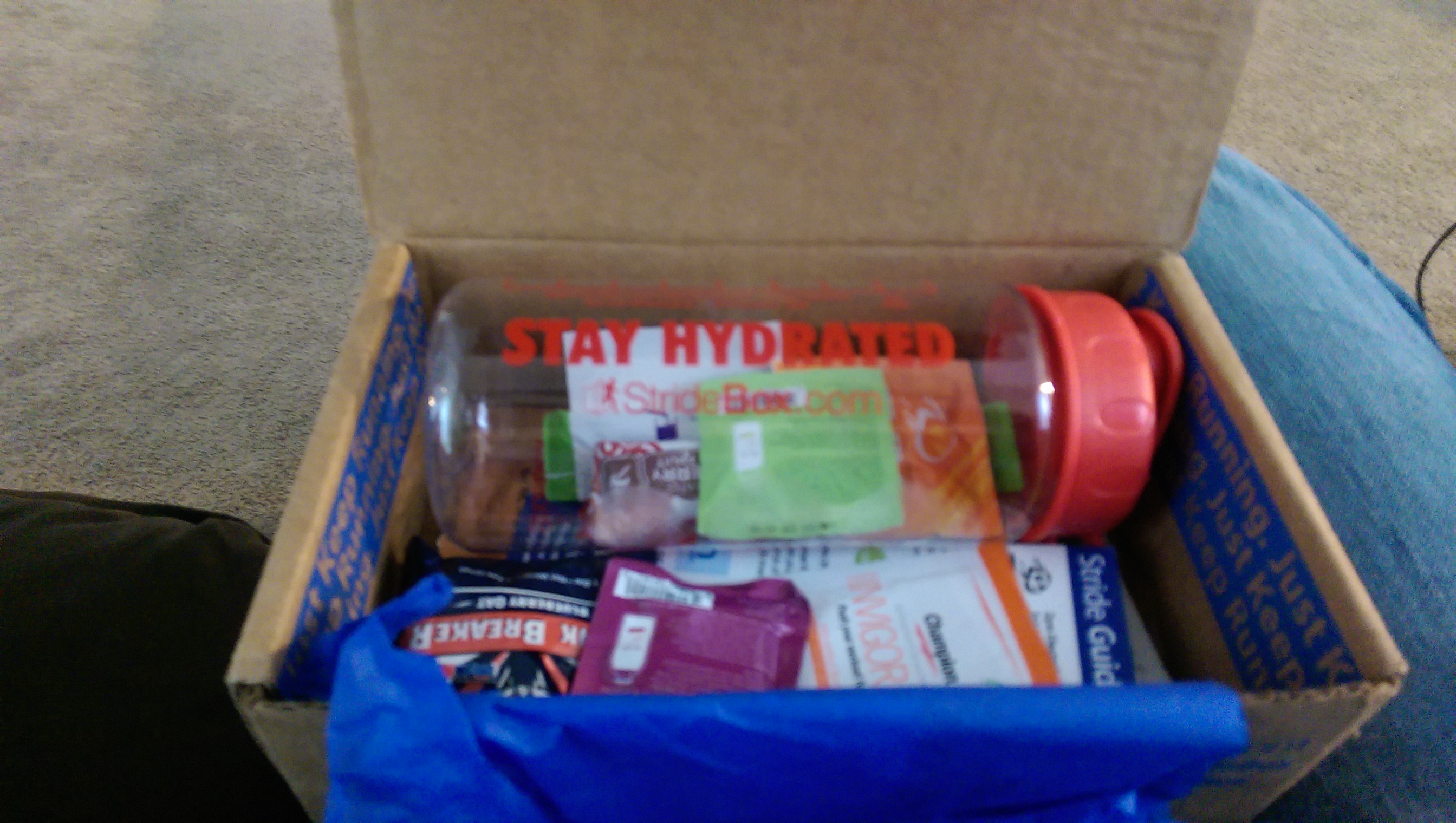 So what is StrideBox? Think of it as a grab-bagbox of running stuff. Usually there is one “item” of some sort, then different snacks/drink powders/GU/etc. As an example, I just happen to have pictures for my July box! (I may not have been blogging – but I was thinking about blogging!)
