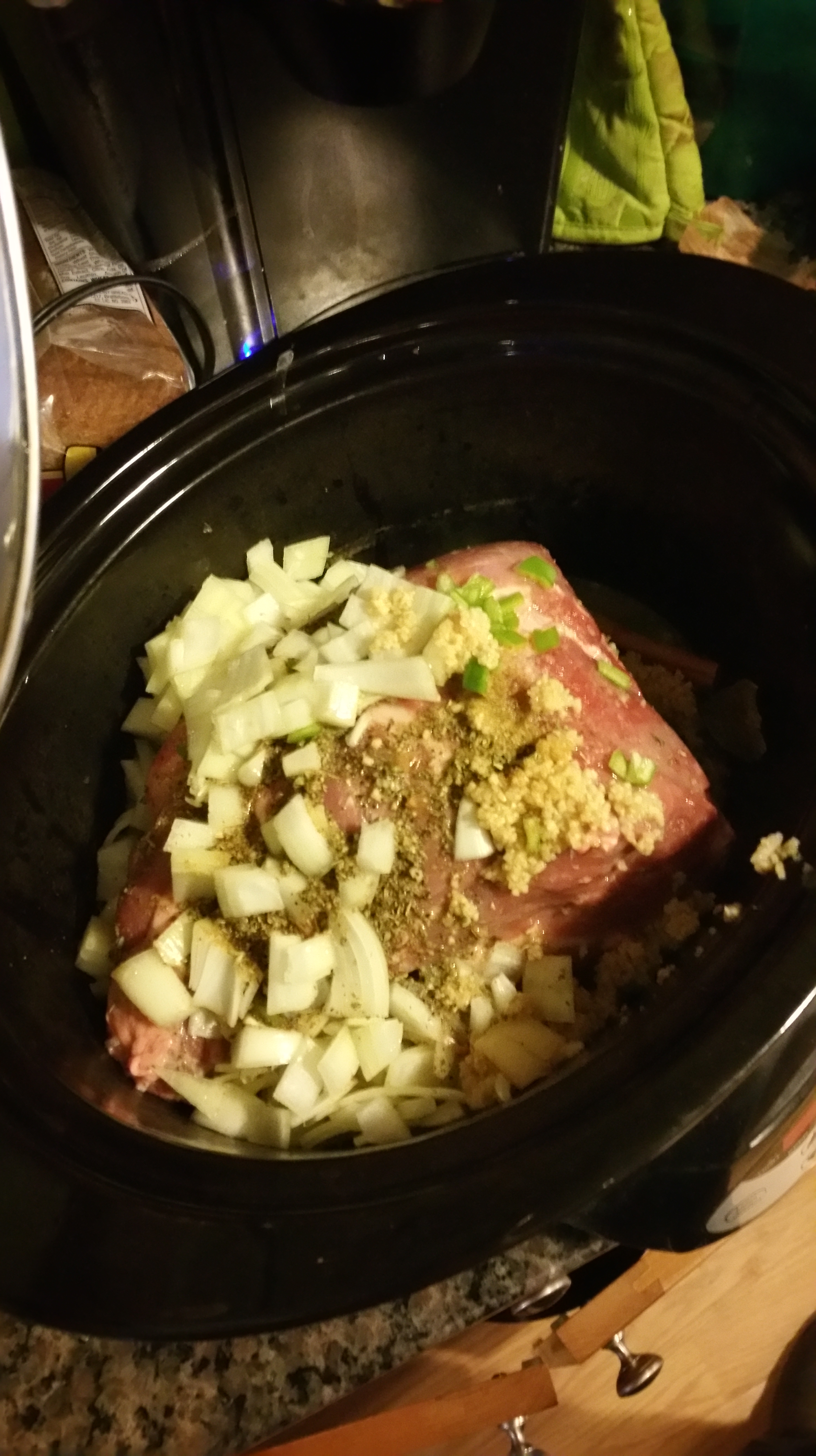 1) Slice Onions and layer in the bottom of the Crock-pot.