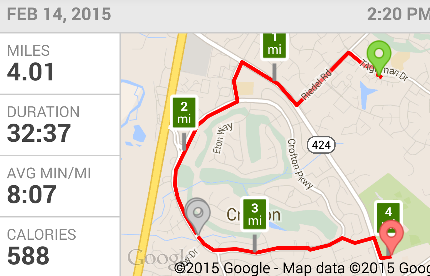 Ah, but I have been side tracked.. My run. As I started, my legs wanted to return to my under-8 minute a mile pace from the previous week’s run. Unfortunately, my lungs (and more importantly, the traffic lights) did not want to cooperate. (For the record, I’m a stand and glare at the light runner) It is all ok though, because the run felt pretty good, despite the breathing not going as planned. I had enough time to get a few miles in before my wife and I had to leave for our Valentines’ Day dinner.