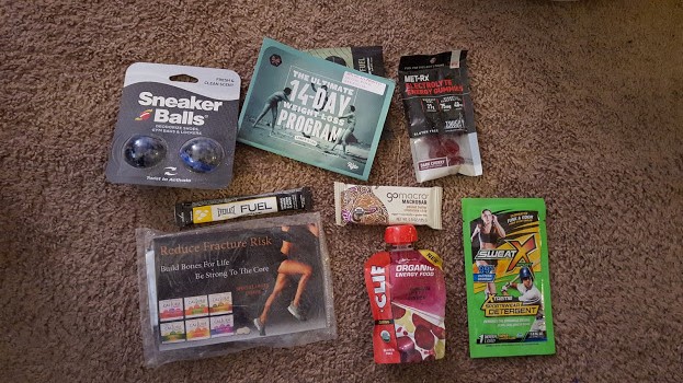 According to me – its like a runner’s grab bag! It will contain one gadgetry thingy (lights for my shoes, stretching band, no-tie shoe laces, water bottle, etc), some sort of race-refueling stuff (gels, powders, bars, etc) and who knows what else?