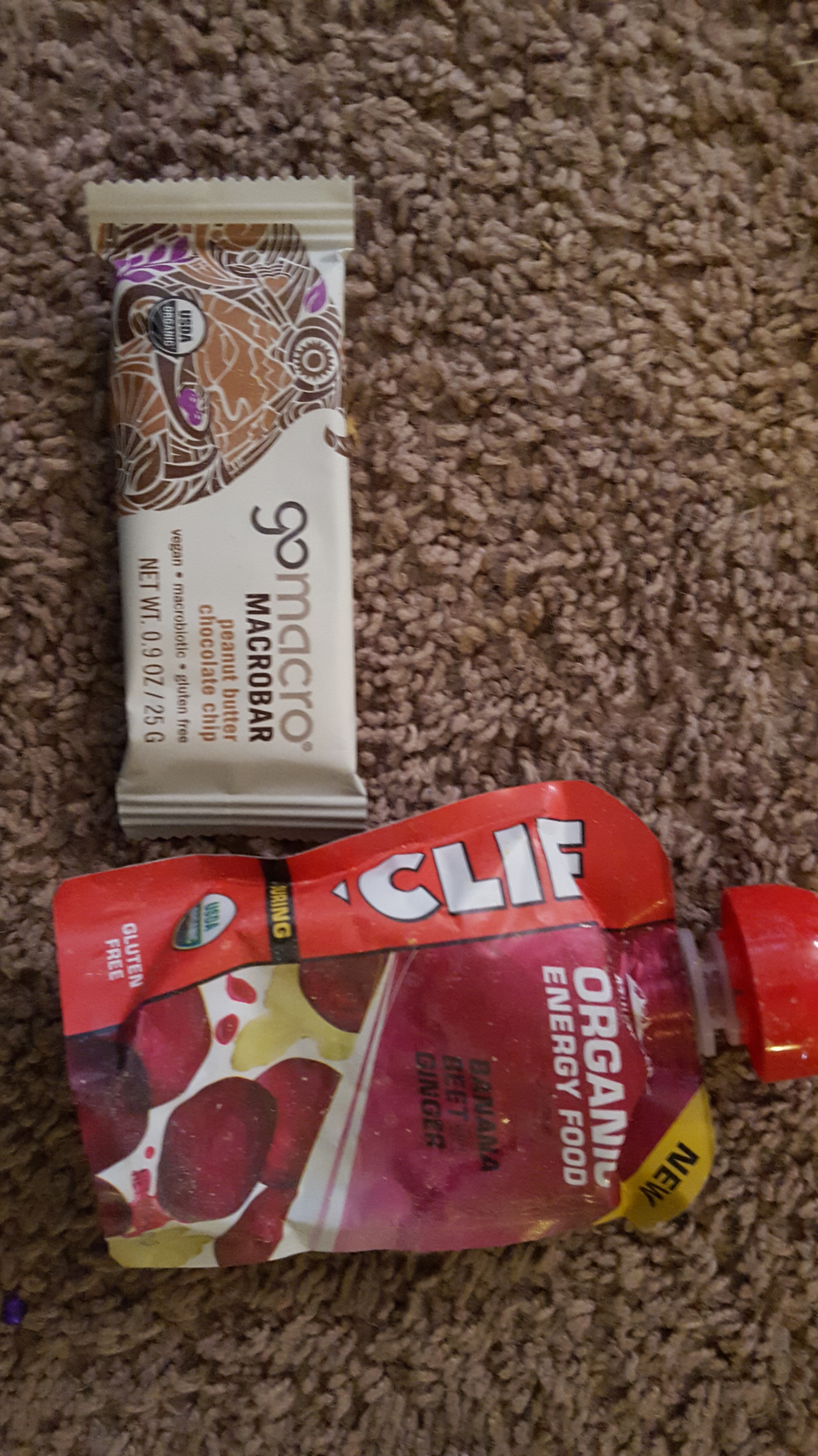 Clif Organic Energy Food – Banana Beet Ginger (I’m not sure about this one!) and the GOMacro Bar – Peanut Butter Chocolate Chip