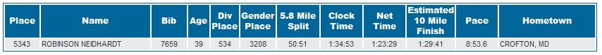 Yet, it did.. and, kick it in I did… The last mile or so is primarily up hill with a down hill at the very end. I will admit that on that up hill, with my kick-that-I-don’t-have, I was very happy it was less than 10 miles. Realistically, I think that the extra .5 mile would not have affected my pace – I was very focused on NOT slowing down.. It simply wasn’t an option. I’ve never had that level of will power in a run before, it was an experience. I know understand what is meant when everyone talks about running being more mental than physical.